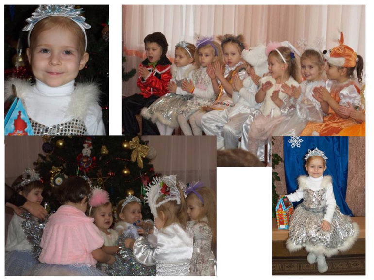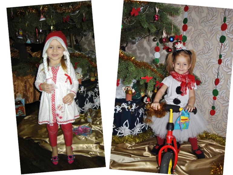 В этом году Вика нашла пакет с мамиными заготовками к нарядам, так уже много дней одно из любим занятий - это превращение Вики, то в пирата, то в мишку, то снеговик, то бабочка, то Дед Мороз, еще у нас есть летучая мышь и тыква с Хэллоуина, Вика выходит, одевается и кричит нам, кто к нам идет, мы громко зовем ее, и она начинает представление с каждым из героев по своему, так что мы каждый день на театральном представлении. И мы уже тоже выучили весь утренник, представление Лунтик, все игры с утренника ШкОлы ПонарОшку, а игрушки еще и танцы выучили, поскольку она их рассаживает на коврики и учит всех движениям, которые выучила на танцах)) А вот она себе снегурочку с гардероба подобрала)))