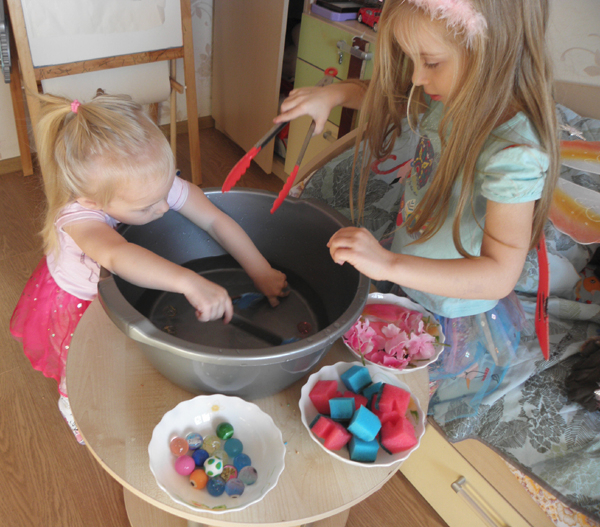 Игра для мелкой моторики: камни, искусственные цветы, разрезанные губки - вылавливать пинцетом и ситом, сортировать. Вот очень понравилось! Дети долго и упорно все вылавливали с огромным увлечением!