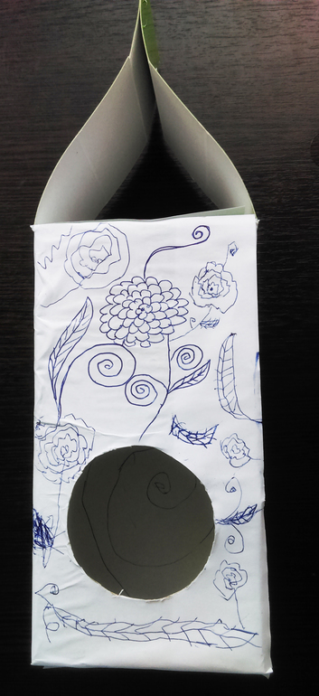 Начали с постройки скворечника-почтового ящика (коробка от какого-то шампуня):