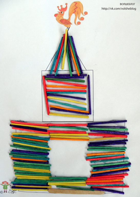 Почитали сказку А. С. Пушкина. Соня сделала Дворец Царя Додона, палочки приклеивала на клей пва: