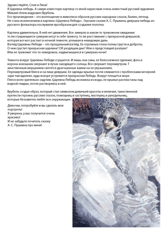 Раз уж начали с А.С. Пушкина, то еще вспомнили Царевну-Лебедь. Смотрели мультик и фильм "Сказка о царе Салтане". Ну и конечно рассматривали картину М. А. Врубеля! Люблю ее еще с детства, помню отчетливо, как сама маленькая, может как Соня как раз или чуть старше, пыталась ее "нарисовать") Вообще, пытаюсь приобщить детей к шедеврам изобразительного искусства, но эту уже будет отдельный пост!