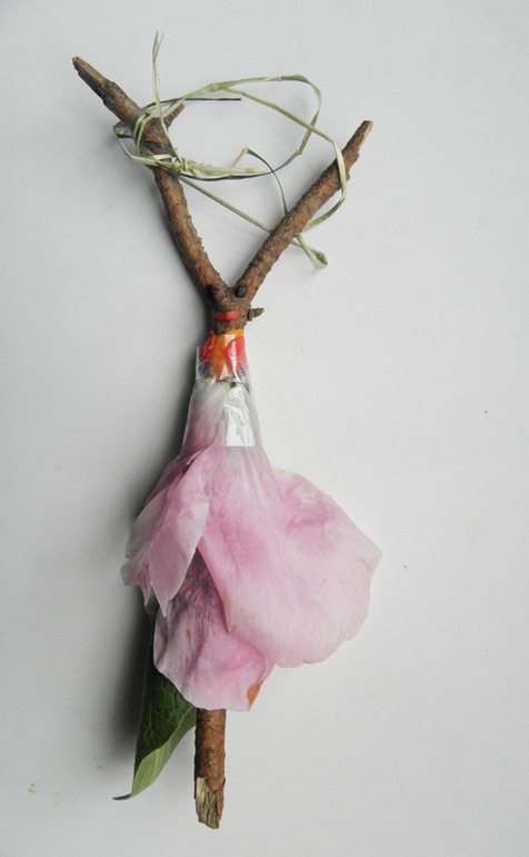 Задание - выложить из природных материалов колибри, вот такую птичку придумала Соня, конечно же из цветов)