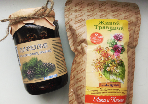 Порылись в аптечке, нашли ромашку, кору дуба. Еще купили вот такое интересное варенье из сосновых шишек! Лечебное) заодно и замечательный чай из клевера и липы: