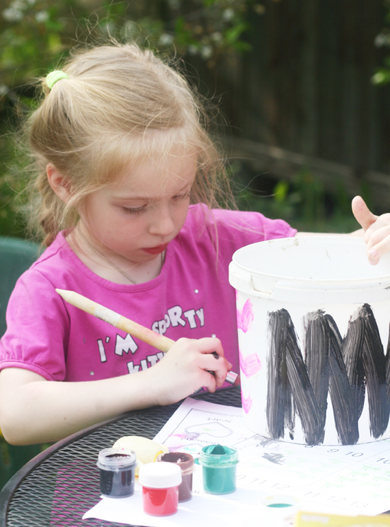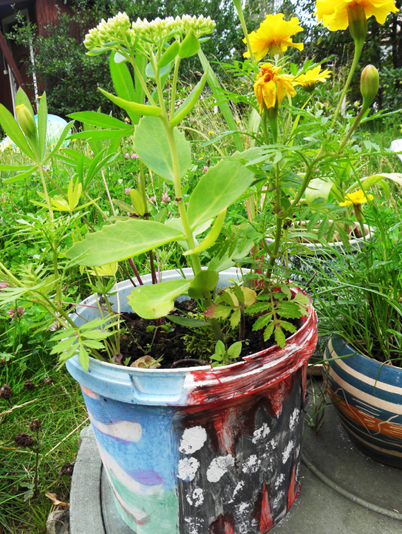 Соня разрисовала весной горшок акриловыми красками (пластикове ведро от какого-то материала типа краски):
