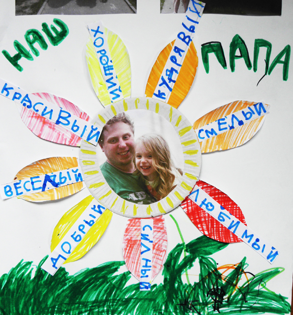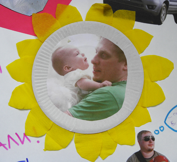 И даже нашему папе достались свои цветочные подарки - делали ему большую открытку, а в качестве рамочек придумали сделать такие цветы: