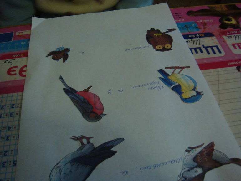 Для начала показала картинки птиц и спросила кто это. Лиза узнала только сороку и гулю. С помощью подсказки первого слова назвала еще воробья, синичку, ворону. Выделили обобщающее слово - птицы. С этим проблем нет.