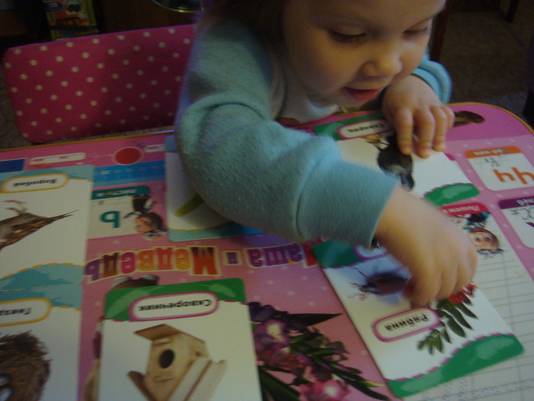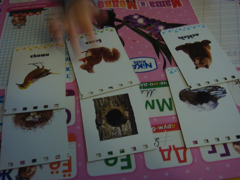 Затем посмотрели карточки и домики птиц. Скворечник Лиза видела в садике, а гнездо новое для нее слово. Все-таки о птицах мы ничего не знаем. Еще и слово для нас трудное. Сначала говорила ГНЕЗГО...но потренировавшись научилась говорить правильно.