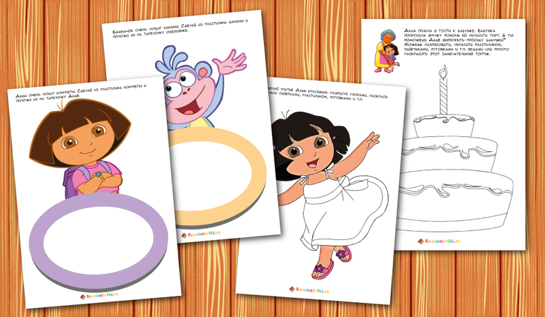 Сделать из пластилина угощения для Даши и Башмачка, помочь украсить торт и преобразить платье Даши.