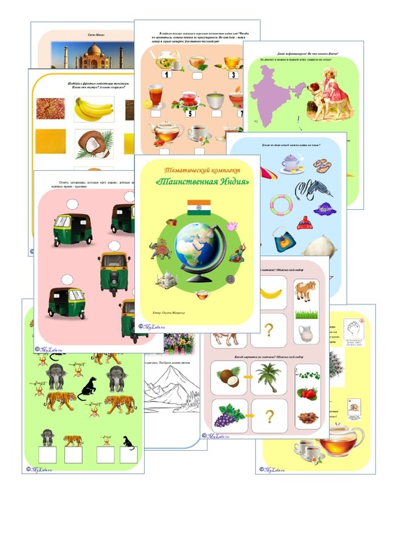 Комплект - не просто комплекс развивающих заданий, это ещё и источник удивительных фактов и энциклопедических знаний, преподнесённой в доступной и понятной для детей форме. В ходе выполнения заданий малыши узнают о праздниках и традициях Индии, совершат виртуальное путешествие в различные индийские уголки, чарующие своей природой: Гималаи, ГОА, джунгли, пустыня… Из комплекта дети узнают о животных, проживающих на территории Индии, об их необычных повадках. Например, о том, что гималайский медведь спит не в берлоге, а в дупле, кто такой гавиал, как выглядит речной дельфин и др. Также дети познакомятся с достопримечательностями Индии.