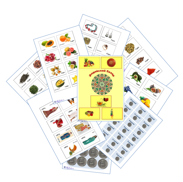 В тематический комплект входит настольная математическая игра «Индийский базар», которая познакомит детей с национальными костюмами, украшениями, местными специями, различными видами чая и экзотическими фруктами, растущими в Индии.