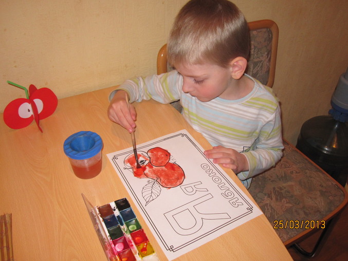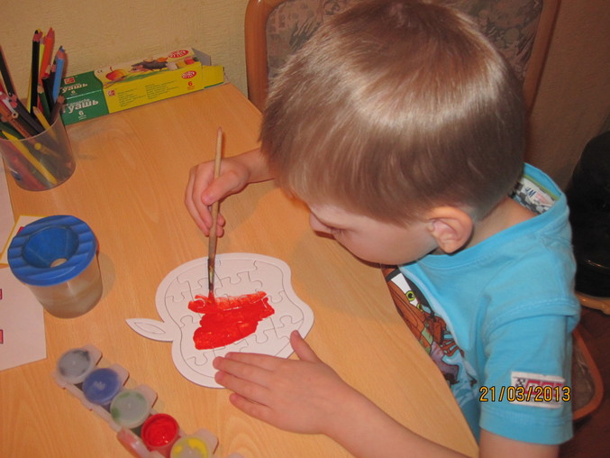 Раскрашивали Пазл Яблоко, потом, когда высохло собирали, и сейчас его вытаскивает и собирает, понравилось!!