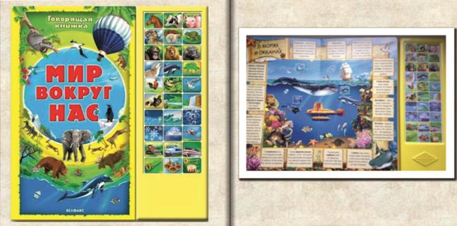 Мир вокруг нас. Из серии «говорящих книжек». Сын тоже полюбил эту книгу, больше всего ему нравятся звуковые кнопочки. Страницы сделаны из плотного картона, цвета очень яркие, насыщенные.