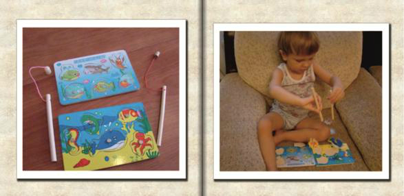 Никита ловил их с удовольствием, и «запускал обратно в море», складывал в рамку, потом купили еще одну рыбалку, теперь у нас две удочки, играет теперь одновременно двумя руками или вместе с папой играют наперегонки, кто быстрей выловит всех рыбок.