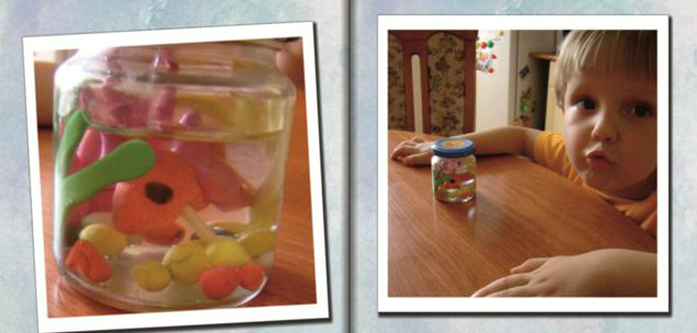 А пластилиновый лепил сам, катал колбаски- водоросли, шарики-камушки, единственное с рыбкой пришлось немного помочь. Взяла баночку из-под детского пюре и крышку приклеила, чтоб случайно не открыл и не пролил, всем с гордостью показывает какой у него аквариум есть.