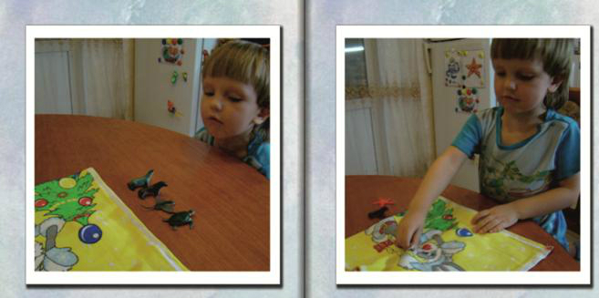 Берем несколько видов морских обитателей (у нас это фигурки: скат, дельфин, краб, рак, морская звезда, осьминог, тюлень, морской лев, черепаха можно использовать карточки), количество зависит от возраста ребенка, где то 3-4 предмета, если ребенок легко справляется, добавляем еще. Выкладываем на стол, просим запомнить их. Затем накрываем платком, и просим малыша их назвать, если ребенок назвал обитателя, вы его достаете из-под платка. Второй вариант выкладываете все фигурки перед ребенком, просите запомнить, ребенок закрывает глаза, и прячете одну фигурку под платок, если ребенок не может вспомнить, даёте пощупать через платок, в принципе мой сразу угадывает. Мы часто играем в такую игру, она хорошо развивает память и можно использовать во всех тематических неделях.