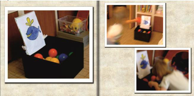 На коробку прицепили картинку кита, и бросали в него цветные мягкие мячики, развевали меткость. Запоминали основные цвета на английском языке (красный, синий, зеленый, желтый, белый, черный, коричневый, розовый, серый, фиолетовый). Играли каждый день, и ребенок достаточно быстро запомнил все цвета. Извиняюсь за качество фото, в движении не очень получились.
