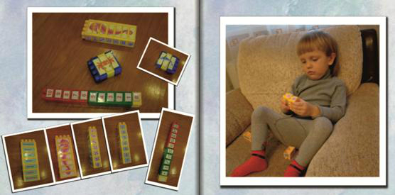 Никак не хочет собирать картинки на кубиках, только строит из них башни и постройки различные, но зато очень любит строить из конструктора, наклеила картинки морских обитателей на детали конструктора, получился мини-пазл, и заодно повторяем цифры, дни недели, счет.