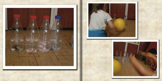 Можно просто приклеить изображения обитателей вод к кеглям, но так мы уже играли, решили немного видоизменить, в качестве кеглей взяли обычные прозрачные бутылки из-под молока и набрали в них воду, спустили в них фигурки (краб, дельфин, акула, черепаха, рыбка, осьминог, скат), на мячике нарисовали изображение акулы. Когда наиграемся, ставила бутылочки на видное место, Никита часто разглядывал и тряс их, и называли, кто в них находится на русском и на анг. языке.