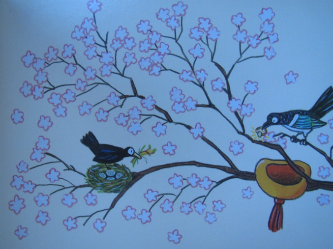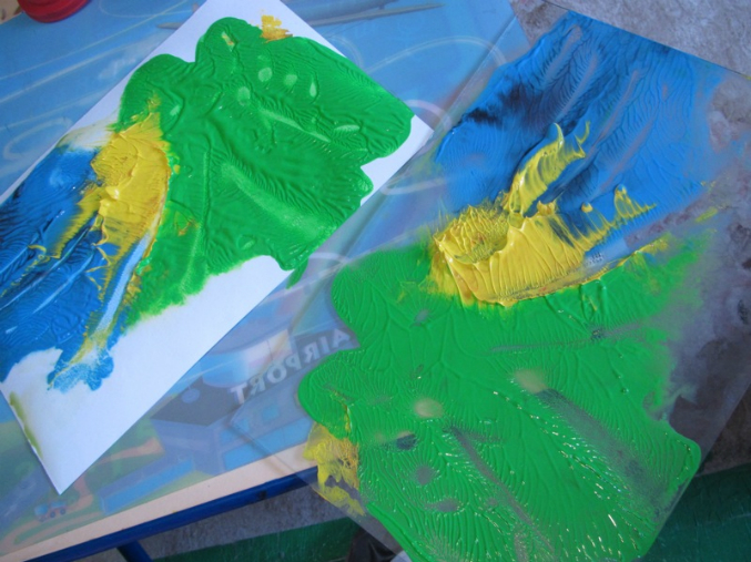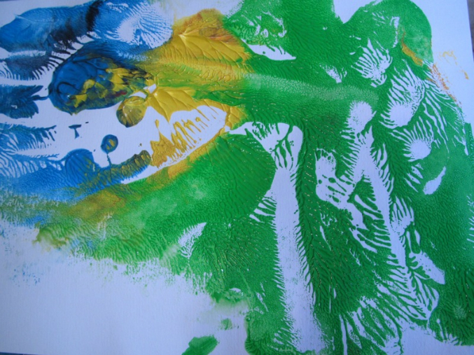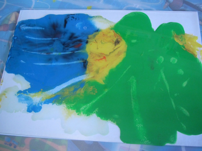 Лежали дома, просила Степу закрыть глаза и представить какого цвета весна, какая она теплая, ласковая! Глаза правда он не захотел закрывать. Но цвета представил и потом мы с ним рисовали весну! Вот что получилось: