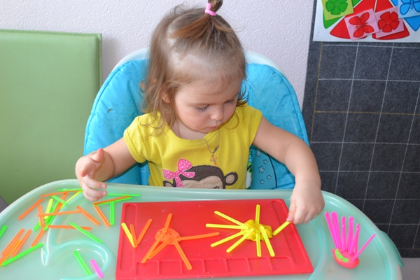Очень понравилось Настюхе делать вот такое солнышко из пластилина и счетных палочек. Раньше мы делали из зубочисток, с счетными палочками ярче получается.
