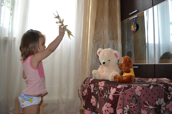 Еще зимой во время лесной недельки мы уложили мишку спать в берлогу. Но пришла весна, пора медведю и просыпаться. Очередной раз, сделав солнышко из прищепок, мы пошли будить мишку от зимней спячки. «Миша, вставай» кричала Настя.