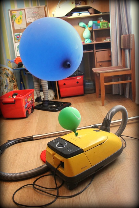 А последний опыт Андрей придумал сам! Когда мы ездили в "Экспериментаниум", он там видел, как поток воздуха держал большой надутый шар. Очень забавно, и даже взрослых впечатляет. И тут, дома, когда я пылесосила, он обнаружил, что из пылесоса тоже выходит такой поток воздуха,, и принёс свои воздушные шары. Радости не было предела. Ведь они точно так же зависали в пространстве и падать не собирались. Пылесосу не было пощады в этот раз. Мы долго не могли наиграться))