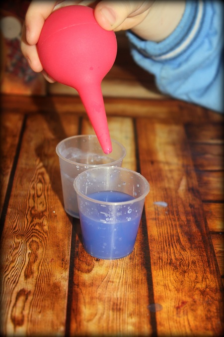 Начали с жидкостей. Переливали воду (синяя она просто для красоты) из одной мензурки в другую с помощью пипетки.