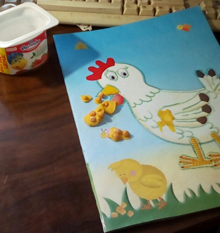 На листок рядом с курицей приклеивали зернышки из пластилина, а поверх горошины.