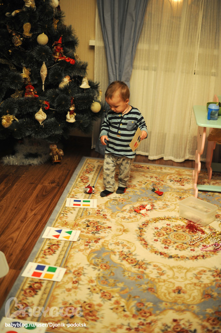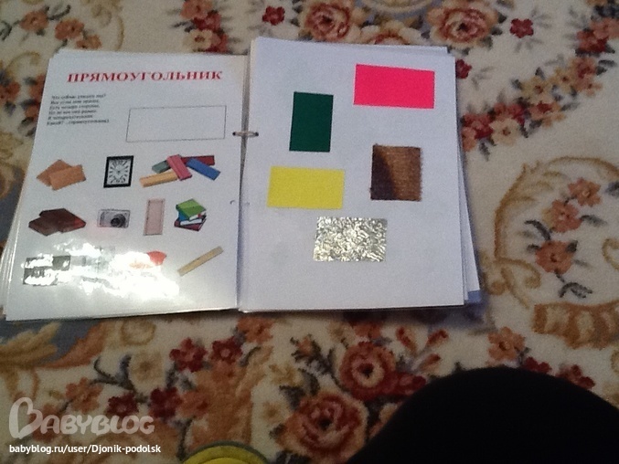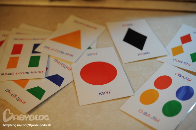 Раскладывали на ковре карточки с изображением 4 одинаковых фигур, а себе я брала карточки с одной фигурой. Показывала, например, круг и просила отыскать и принести карточку с кружочками. Находил всегда без ошибок, сама идея понравилась.