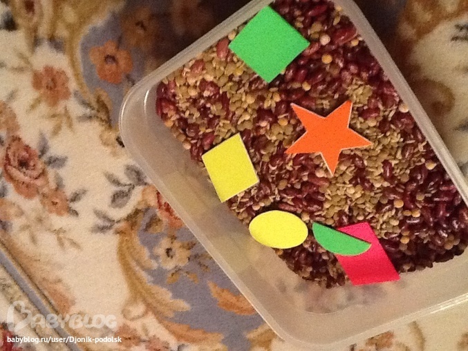 Сыну очень нравилось копаться в зернах, выискивать фигуры. Мы совместили это дело с изучением карточек. Раскладывали карточки, искали фигуры и клали их на соответствующее изображение. Лото вобщем)). Очень нравилось, все время просил поиграть именно в эту игру)