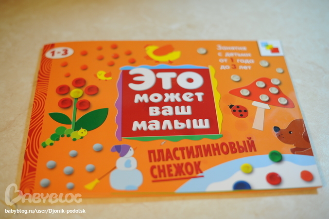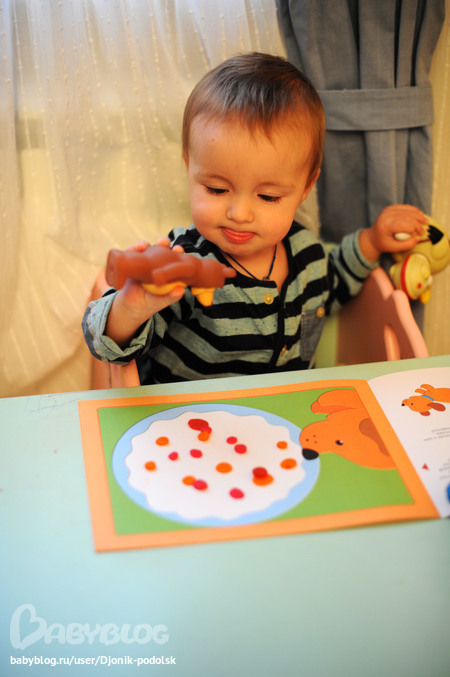 7. Лепили из пластилина. Катали колбаски(сам катает), шарики катала мама, а Ваня из них делал блинчики)). Это занятие его очень привлекло и мы решили использовать альбом серии "Это может Ваш малыш" "Пластилиновый снежок". За неделю излепили весь)