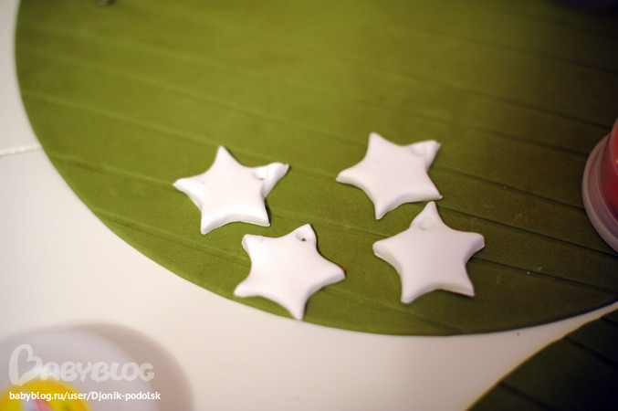 9. Звезды на елочку). Так как наша неделя геометрии проходила прямо перед Новым годом, то мы конечно этим воспользовались))). Сделали подарочки бабушкам и свою елочку украсили. Использовали массу для лепки, отвердевающую на воздухе, форму из сортера, дырочку протыкали ручкой без стержня. Потом мама продела ленточки. Итог, к сожалению не сфоткали, зато есть процесс):