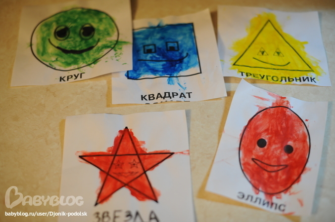 Выучили: круг, квадрат, треугольник, овал, прямоугольник, ромб, трапецию и пятиугольник. Из объемных: шар, куб, конус.Как-то заодно незаметно повторили цвета и выучили несколько неизвестных ранее. Все фигуры искали в жизни и сын из научился видеть. Одела как-то платье, а он бежит, тычет в меня "бомб, БООМБ"! Я сначала не врубилась, а потом смотрю на свое платье, а там рисунок ромбиками)))). Пытается называть названия фигур (ПП-трапеция, бомб-ромб, тк-квадрат и тд- всегда на определенную фигуру говорит одинаковое сочетание звуков).