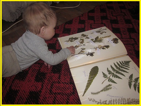 В заключении этого дня, я дала Ромаше заготовленные с прошлого года листочки клёна, он их потрогал,покрощил.