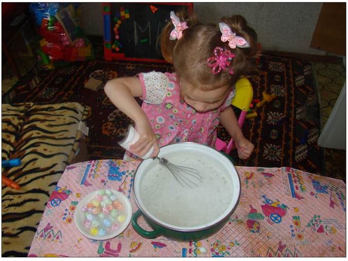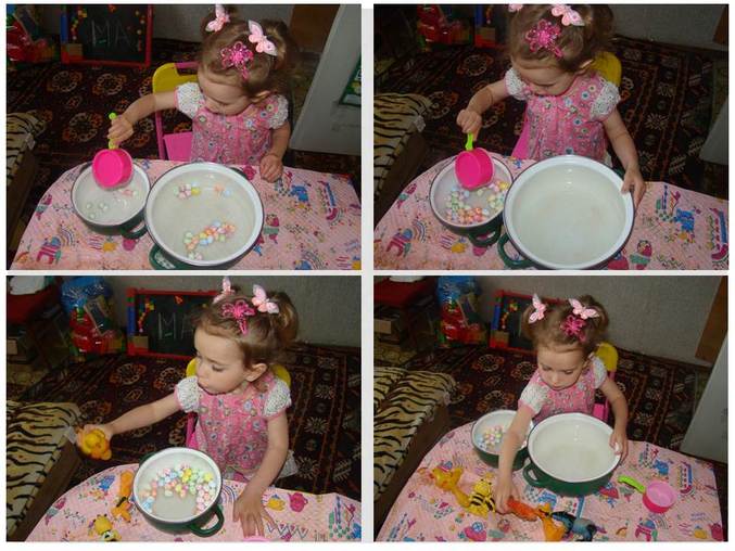 3) Далее идем мыть руки и видим, что Зайка опять от нас ускакал и оставил следы – собираем яички и по следу приходим в ванную комнату, в которой обнаруживаем кастрюльку с водой и малюсенькими цветными яйцами. Задание ясно – нужно выловить все яйца из воды при помощи ложки. С заданием Даша справилась, поиграла: