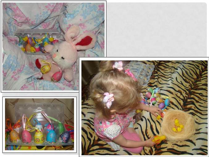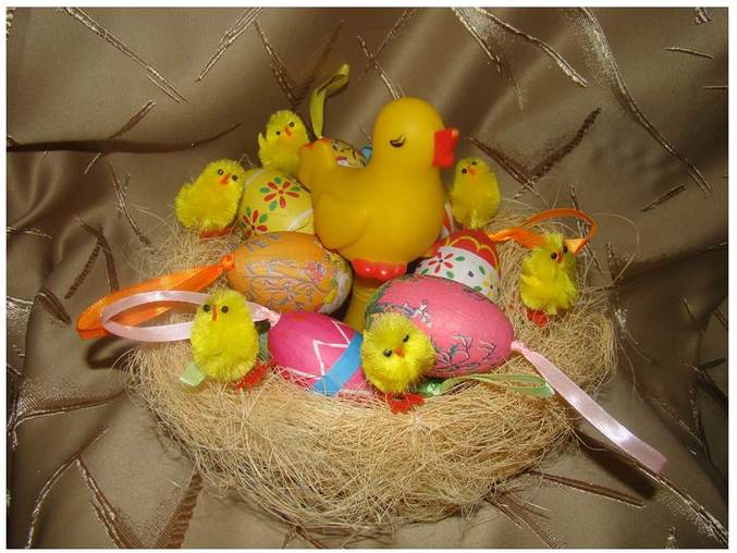 Наше приключение началось с того, что вчера вечером Даша получила маленький подарочек – гнездышко с мамой-курочкой, цыплятками и разноцветными пасхальными яйцами.