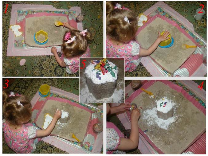 и приходим к мини-песочнице, рядом с которой стоит вкусненькая паска. Нужно сделать такую же для Дашиных игрушек - делаем паску, посыпаем сахарной пудрой и цветными макаронами и, конечно же, всех кормим: