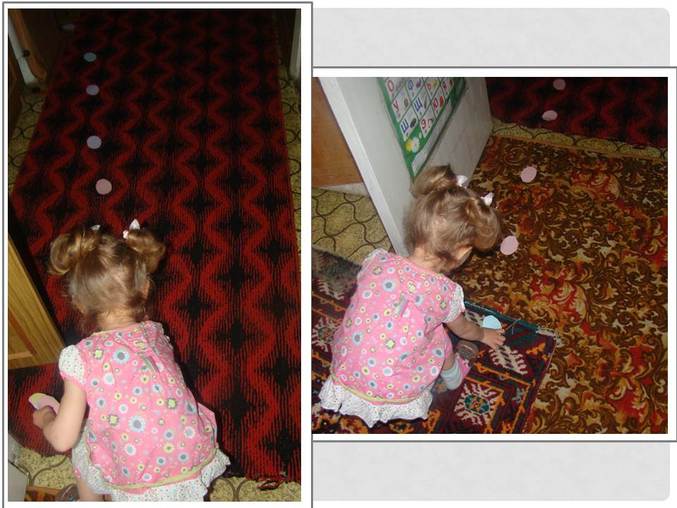 2) Начинаем поиски: Тут мы обнаруживаем, что зайка был неосторожен и оставил после себя следы – идем по следу (вырезанные яйца из бумаги):