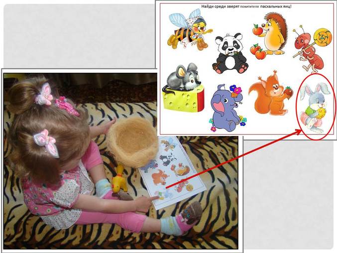 4) И тут Даша снова заметила следы, которые на этот раз привели нас к пасхальной раскраске. Рассматриваем, раскрашиваем яйцо: