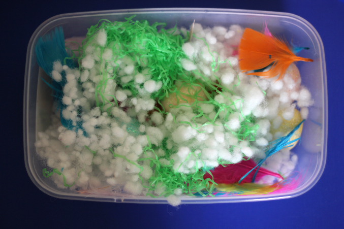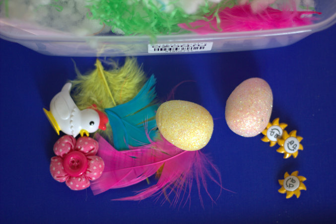 3. Сенсорная коробочка. Наполнение: шарики холофайбера (такие, которыми набивают мягкие игрушки), бумажная "травка" (буду благодарна за подсказку, где такую купить), яйца пенопластовые, пуговицы в виде солнышек, перышки, фигурка курочки из "Растишки" и цветок от резинки )