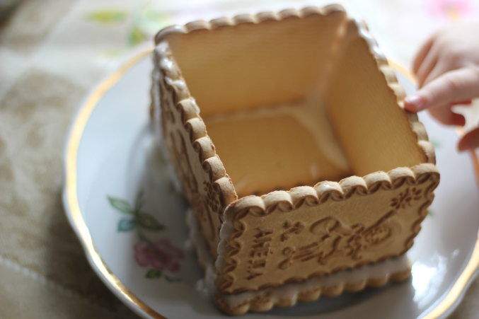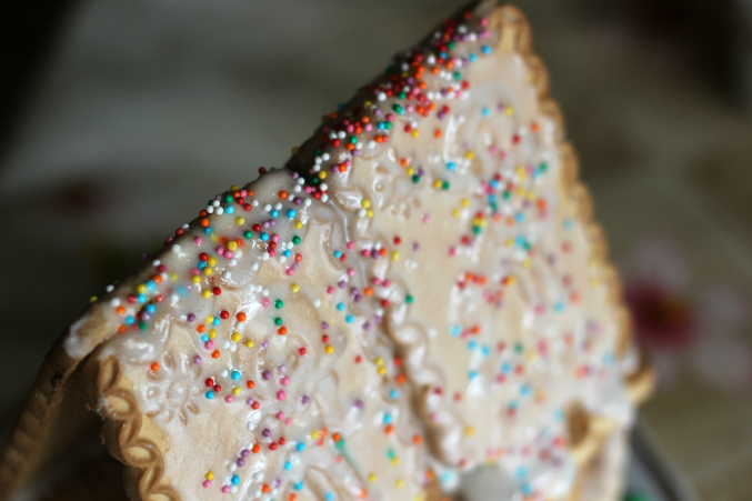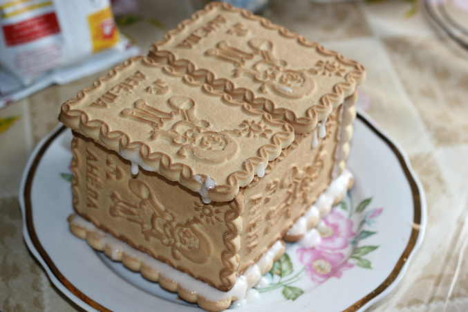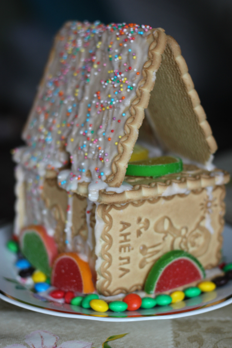 7. Сделали сахарный домик: печенье скрепили сахарной глазурью, посыпали посыпкой "бисер", обложили m&m и мармеладом.