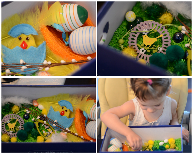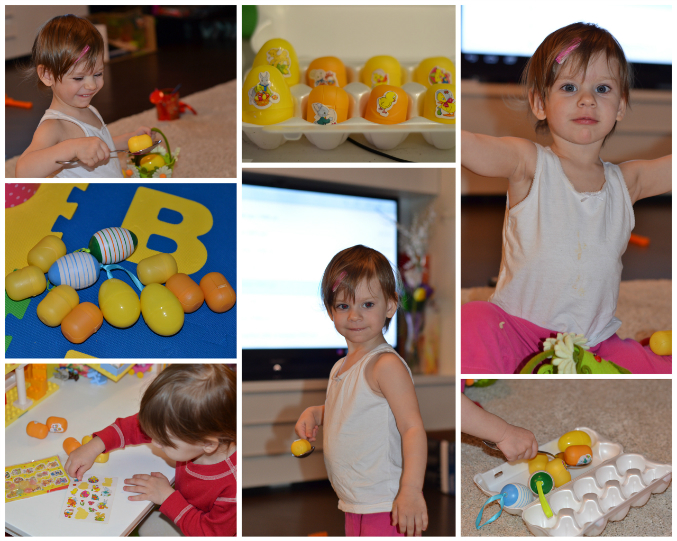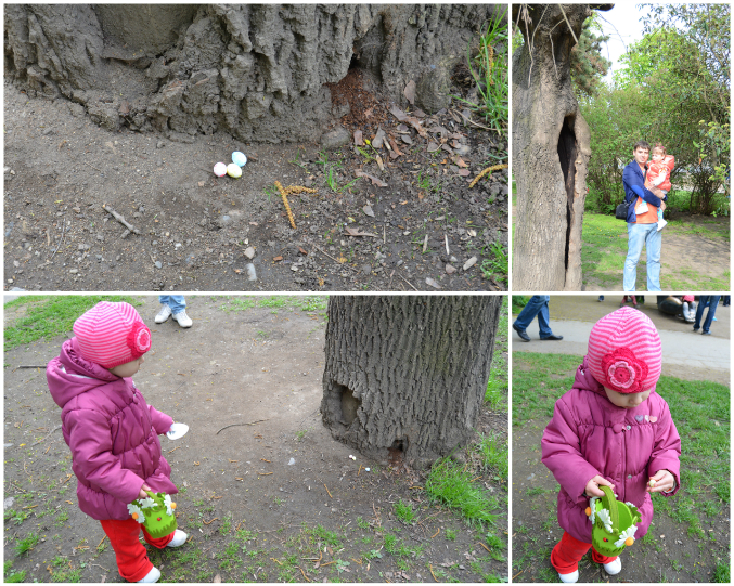 Устраивали поиск яичек дома и в парке в Праге. Милане очень понравилось одно дерево, она показывала на дупло и ухала-тапо там филин живет, а птицу мы видели накануне в зоопарке, поэтому придумали историю,что прилетел филин и оставил Ми яичек, из которых вылупятся маленькие совушки-она была счаслива. Не могла поверить своим глазам!