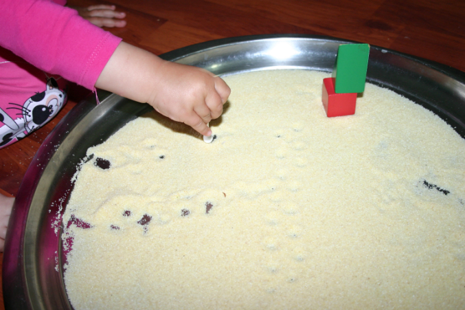 Взяла поднос с манкой,из кубиков построила теремок.