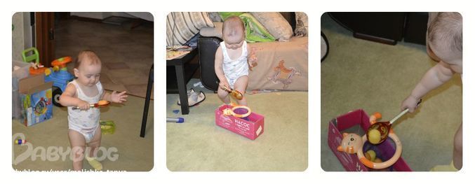 Вторая: мы эти "яички" носили в ложке в корзинку, дочка очень старалась и, когда у нее получалось донести с одного конца комнаты к другому, ликовала и бегом бежала за следующим.