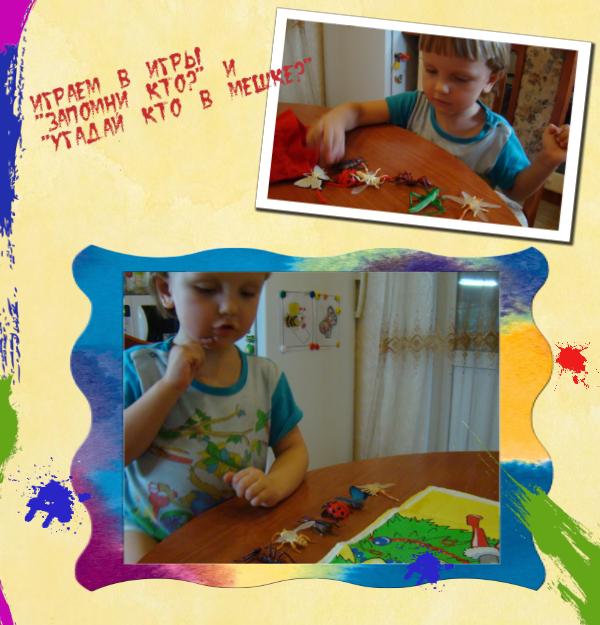 Никите 2,6 он знает, кто, как выглядит и что делает, моими задачами было: расширить знания о насекомых, развить умение видеть сходства и отличия между ними, отличать и называть, почему одни насекомые вредные другие полезные, обратить внимания на отличия пауков от насекомых, познакомить с жизненным циклом бабочки, разновидностями бабочек и жуков, с понятием маскировка, на примере листовидки, палочника, кузнечика, бабочки. Но и не забываем про анг.язык.