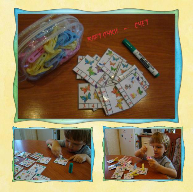 Карточки-счет, считаем сколько насекомых изображено и заштриховываем это число маркером для белой доски, карточки обклеила скотчем, потом тряпочкой все легко стирается и опять используем карточки. Счет до 10, Никита отлично справился, один раз только сосчитал правильно, а заштриховал другое число. Тоже самое с прищепками, считаем и прицепляем на соответствующую цифру. С этим заданием справился быстрее.