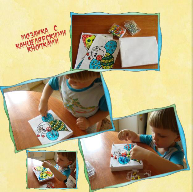 Самодельная мозаика с канцелярскими кнопками . Для совсем маленьких не советую, могут поколоться, мы и то всегда играем под моим строгим присмотром и только на столе. Опять же Никите она нравится.