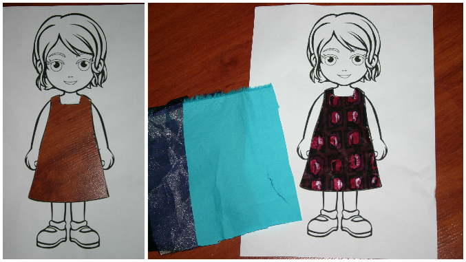 6.Наряжали девочку. Вырезала платье,подкладывали разные кусочки ткани.