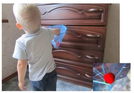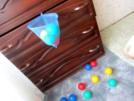 Для игры нужен, сачек, мячи или шарики для сухого бассейна, и задвижные ящики комода.