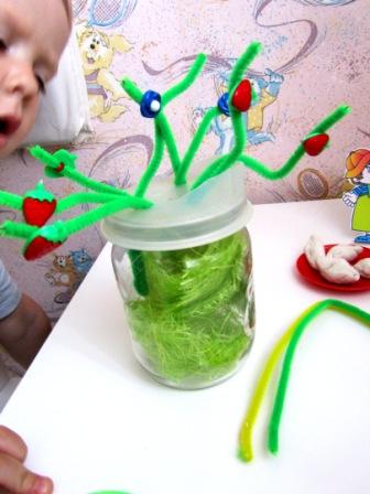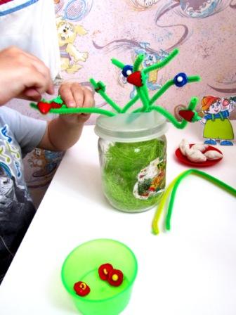 Потом предложила игру с пуговицами, нанизываем ягодки (а потом и цветочки на пушистую проволоку- кустики)